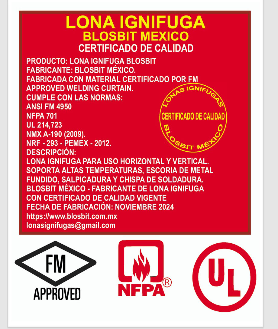 Cumplen con la NORMA DE REFERENCIA NRF - 293 - PEMEX - 2012 - CBV, (LONAS IGNIFUGAS), la cual se aprobó en el Comité de Normalización de PETRÓLEOS MEXICANOS y Organismos Subsidiarios en la Sesión 90, celebrada el 29 de Noviembre de 2012.